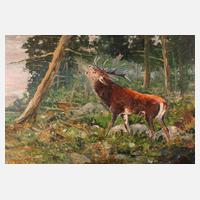 röhrender Hirsch am sommerlichen Waldrand, pastose Malerei mit breitem Pinselduktus, Öl auf Leinwand, links unten signiert und datiert ”Ph. Wacker 1912”, rückseitig auf originalem Künstleretikett betitelt, signiert und datiert ”Austretender Hirsch - Gemälde v. Phil. Wacker 1912” hier auch stark verblasst druckbezeichnet ”Phil. Wacker Düsseldorf”, original in ca. 9 cm breiter Goldstuckleiste gerahmt, Falzmaß ca. 65 x 94,5 cm.