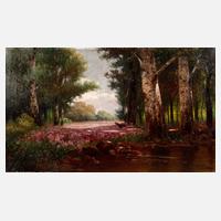 zwei Kinder auf üppig mit Waldweidenröschen bestandener, sonniger Waldlichtung am Bach, beim Blumen pflücken, pastose, impressionistische Malerei mit lockerem, breitem Pinselduktus, Öl auf Leinwand und Keilrahmen, um 1910, rechts unten signiert ”R. Weber”, gering restaurierungsbedürftig, ungerahmt, Maße ca. 50 x 82 cm.