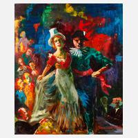 Arlecchino und Colombina in der Manege, expressive, pastose Malerei mit breitem Pinselduktus in kraftvoller Farbigkeit, Öl auf Leinwand und Keilrahmen, um 1980, rechts unten signiert ”Rudolf Wehn”, minimal restaurierungsbedürftig, ungerahmt, Maße ca. 70,5 x 60 cm. Künstlerinfo: dt. Landschafts- und Genremaler (1911 München bis 1998? München), studierte in München bei Prof. Peter Kalman und in Venedig bei Prof. Belluzi, ab 1936 freischaffend in München tätig, Quelle: Internet.