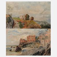 zwei jeweils an Steinufern befindliche südländische Küstenszenen mit Künstlerhäusern, Öl auf Leinwand, undatiert 1. Hälfte 20. Jh., unten rechts signiert ”Ch. Widmann”, reinigungsbedürftig, Erhaltungsmängel, in Goldstuckrahmen (Erhaltungsmängel), Falzmaß ca. 30,5 x 50 cm.