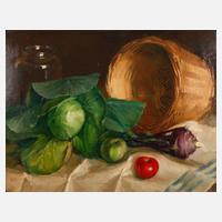 stimmungsvolles Arrangement aus Weißkohl, Kohlrabi, Tomaten und Apfel, neben Einweckglas und Weidenkorb, minimal pastose Malerei, Öl auf Karton, um 1940, unsigniert, rückseitig gestempelt ”Nachlass Hand Wohlrab 1905-1978 - Walter Wohlrab, Frankfurt a./M.”, Malgrund wellig, sehr schön in Goldstuckleiste gerahmt, Falzmaße ca. 55,5 x 71 cm. Künstlerinfo: dt. Maler, Zeichner, Graphiker, Kunsthistoriker und Porzellandesigner (1905 Eger [Cheb] bis 1978 Nabburg/Oberpfalz), Sohn und Schüler des Dresdner Malers Karl Wohlrab (1873 bis nach 1930), studierte 1932-37 an der Akademie München bei Fritz Hellmut Ehmcke, Josef Hillerbrand und Meisterschüler von Constantin Gerhardinger, beschickte 1941-43 die Große Deutsche Kunstausstellung im Haus der Deutschen Kunst München, bis 1945 in Eger ansässig, später tätig in Breitbrunn am Chiemsee, Samerberg und Frankfurt am Main, ab 1961 in Amberg, in den 1950er Jahren als Porzellandesigner für die Kunstabteilung der Porzellanmanufaktur Rosenthal in Selb tätig, Quelle: Glassl-Schreiner ”Kunst in Eger - Stadt und Land” und Internet.