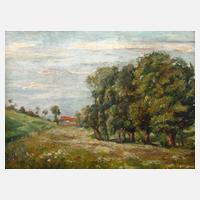 lichte Sommerlandschaft mit Bäumen, am Bieblacher Bach in Gera, minimal pastose Landschaftsmalerei, Öl auf Karton, rechts unten signiert ”A. Wolfgang”, rückseitig betitelt ”Baumgruppe im Bieblacher Grund” sowie teils undeutlich lesbares Widmungsetikett ”Rassegeflügelschau der Landesgruppe Thüringen in Gera - Ehrenpreis der Stadt Gera - Der Stadtvorstand - Dezember 1934 .... Oberbürgermeister”, reinigungsbedürftig, gerahmt, Falzmaße ca. 30 x 40 cm.