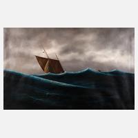 von den tief schwarz-blauen Wogen droht ein kleines Segelschiff fast verschlungen zu werden, Öl auf Leinwand, undatiert um 1900, unten rechts signiert ”A. Zwiener”, Craquelure, Leinwand wellig, in schöner Silberleiste gerahmt, Falzmaß ca. 78 x 121 cm.
