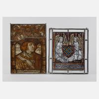 19. Jh., eins mit Darstellung Portrait von Kaiser Maximilian, nach einem Holzschnitt von Albrecht Dürer aus dem Jahre 1519, mit zwei Sprunglinien, das andere mit einem französischen Wappen, von zwei Engeln getragen, Maße 34 x 24 cm und 31 x 26 cm.