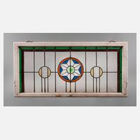 um 1900, Oberlicht mit Sternmotiv, aus Farb- und Ornamentglas, guter Zustand, Maße 113 x 57 cm.
