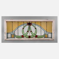 deutsch, um 1900, floraler Dekor aus Buntglas, teilweise marmoriert, im original Rahmen aus Nadelholz, cremefarben lackiert, mit geschnitzter Blüte, Glas im guten Zustand, Rahmen mit Altersspuren, Maße 145 x 60 cm.