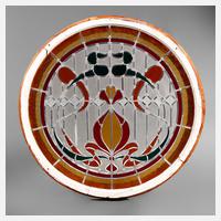 um 1900, ornamentales Jugendstilmotiv, neu verbleit und in jüngerem Rundrahmenfenster eingebaut, eine Scheibe mit Haarriss, sonst guter Zustand, D 100 cm.