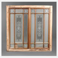 deutsch, um 1880, zweiflügeliges Fenster aus Nadelholz, ornamentaler Ätzdekor mit Rollwerk und Amphorenvase, eine Scheibe aus mattiertem Glas fehlt, sonst guter Zustand, Maße 108 x 107 cm.
