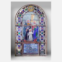 Bleiglas, 2. Hälfte 19. Jh., fein gemalte Darstellung der Maria auf einer Wolke, gemalt von der Hofglasmalerei G. Schneider Regensburg, in originalem Eisenrahmen, zwei Scheiben defekt und drei Scheiben mit Sprung, Maße 175 x 89 cm.