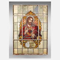 Bleiglas, 2. Hälfte 19. Jh., fein gemalte Darstellung Jesus mit brennendem Herz auf Wolke, gemalt von der Hofglasmalerei G. Schneider Regensburg, in originalem Eisenrahmen, eine Scheibe defekt und vier Scheiben mit Sprüngen, Maße 174 x 122 cm.