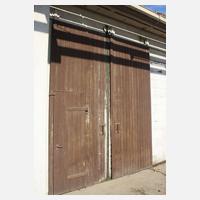 um 1920, Nadelholz lackiert, zwei Flügel mit Rollen, ein Flügel mit Schlupftür, zweiteilig, komplett mit Metallschiene, schwere Ausführung, Oberfläche mit Alters- und Gebrauchsspuren, gesamt B 2,80 m x H 3,30 m ohne Aufnahme, Schlupftür B 0,66 m x 1,90 m.