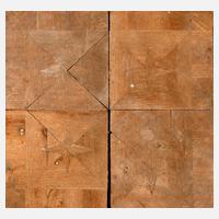 Ende 18. Jh., 35,40 qm, Nadelholz und Eiche massiv, Oberfläche mit Resten alter ornamentaler Farbfassung, extrem breite verleimte Dielenbretter mit Nut und Feder, verbunden durch schmale Bretter aus Eiche, anbei Verlegeplan, professionell ausgebaut und entnagelt, guter Originalzustand, 3 cm stark, B 37 bis 82 cm, Raummaß 5,45 x 6,50 m.