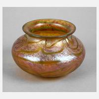 um 1900, Dekor Phänomen Gre, farbloses Glas, ausgekugelter Abriss, aufgeschmolzene Silbergelbkrösel und lachsfarbene Punkte, irisiert, zweifach leicht gebaucht mit quadratisch gedrückter Mündung, geringe Gebrauchsspuren, sonst guter unbeschädigter Zustand, H 10 cm.