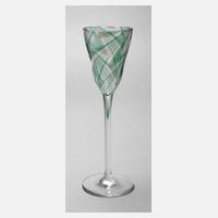 um 1900, Formentwurf Koloman Moser für E. Bakalowits & Söhne Wien, Ausführung Meyr's Neffe, Adolf bei Winterberg, farbloses Glas, Scheibenfuß, leicht konischer Schaft, zweifach gebauchte, schlanke Kuppa mit eingeschmolzenem gekämmten Streifendekor in transparentem Grün und Lachs, guter Zustand, H 20 cm. Quelle: Dekorative Kunst, IV. Jahrgang, Vierter Band, München 1901, S. 229.