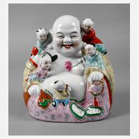 China, 20. Jh., Weißporzellan in polychromer Aufglasurbemalung und partieller Goldstaffage, typische Darstellung des dickbäuchigen Glücksgottes mit fröhlich lachendem Gesicht, in den Händen eine Mala sowie einen Sack haltend, auf seinem massigen Körper fünf kleine, krabbelnde Kindergestalten, H 27 cm.