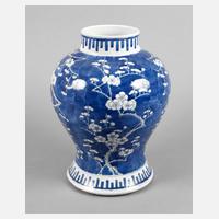 Ende 19. Jh., am Boden mit ungedeuteter Vier-Zeichen-Marke, cremefarbenes Porzellan in kobaltblauer Unterglasurbemalung, stark gebauchter Korpus mit zylindrischer Mündung, umlaufend verziert mit Kirschzweigen, gerahmt von Ornamentband, brandfleckig, H 36 cm.