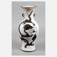 1920er Jahre, am Boden mit ungedeuteter Pressmarke, mit altem Ausfuhretikett bzw. Resten eines alten Wachssiegels, cremefarben gefasstes Porzellan mit reliefiertem Drachendekor in brauner Aufglasurbemalung, Balusterkorpus mit angedeuteten Handhaben in Form kurzer Kirschzweige, ausschwingende Mündung, Craquelure, brandfleckig, teils retuschiert, H 45 cm.
