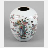 China, 1920er Jahre, signiert, weiß glasiertes Porzellan in polychromer Aufglasurbemalung, stark gebauchter Korpus mit figürlichem Motiv dreier Damen in stilisierter Gartenlandschaft, Deckel fehlt, etwas brandfleckig, H 26 cm.