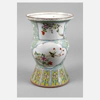 China, 20. Jh., im Stile der Qing-Dynastie, am Boden mit Sechs-Zeichen-Kangxi-Marke, cremefarbenes Porzellan in polychromer Emailbemalung, gebauchte Wandung, umlaufend mit figürlichen Darstellungen verziert, gerahmt von ornamentalen Motiven und Fledermausdarstellungen, zylindrischer Hals mit ausschwingender Mündung, min. brandfleckig, H 48 cm.