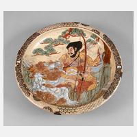 Japan, 19. Jh., ungemarkt, cremefarbenes Feinsteinzeug, aufwendig in Emailfarben bemalt, gemuldeter Teller mit schmalem, ornamental verziertem Rand, der Spiegel mit figürlicher Darstellung aus der Sagenwelt, welche einen Bogenschützen im Zwiegespräch mit einem Drachen zeigt, Craquelure, Altersspuren, mit Wandhalterung, D 37 cm.