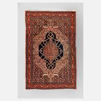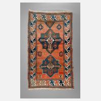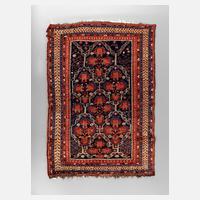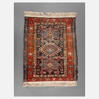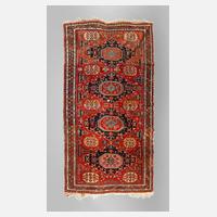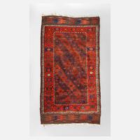 um 1900, rapportierter geometrischer Dekor auf rotem Fond im kräftigen Kolorit, gut im Flor, Ziegenhaar Shirasi und Abschluss des Kelims nahezu vollständig erhalten, Löcher in der Halbbordüre, Reste alten Mottenbefalls auf der Rückseite, Maße 166 x 94 cm.