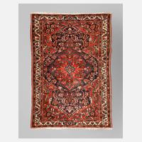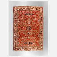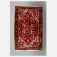 um 1900, florales Zentralmotiv auf rotem Grund, florale Bordüre, für Heriz untypisches Spiegelmotiv, leichte Ablaufspuren im Innenbereich, Schüsse sichtbar, partiell Spuren alten Mottenbefalls an den Außenbordüren, Maße 370 x 261 cm.