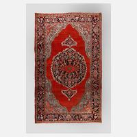 1. Hälfte 20. Jahrhundert, floraler Dekor auf rotem Fond, breite mehrteilige Bordüre, leichte Beschädigungen an den Randabschlüssen, gut im Flor, Maße 218 x 141 cm.