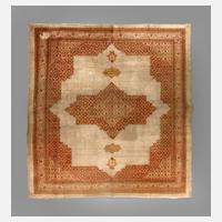 Hadji Jalili, um 1900, geometrisches Zentralmotiv auf beigem Grund, teilweise Flecken, Randbeschädigungen, alte Mottenschäden in äußerster Bordüre, teils Florschäden, Maße 444 x 328 cm.