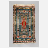 1. Hälfte 20. Jahrhundert, geometrischer Dekor auf rostrotem Fond mit blauen Elementen, Ablaufspuren im Innenfeld, Kolorit leicht verblichen, Maße 190 x 114 cm.