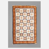 um 1920, großflächiger geometrischer Dekor mit floralen Elementen, mehrteilige Bordüre, Randbeschädigungen mit zwei Löchern ca. 3 x 4 cm im Bordürenbereich, zwei kleine Löcher im Innenfeld, Maße 166 x 126 cm.