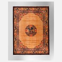 1. Hälfte 20. Jahrhundert, maschinengewebter Teppich mit chinoisem Motiv und Medaillon mit Phönix-Motiv, Maße 337 x 245 cm.
