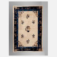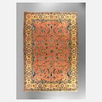 um 1920, Mittelfeld mit zarten Floralmotiven, mehrteilige Randbordüren, sehr feine Knüpfung, partielle Ablaufspuren, Grundgewebe sichtbar, Maße 407 x 321 cm.