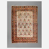 1. Hälfte 20. Jahrhundert, klassisches Shirvan-Motiv auf hellem Fond im Mittelfeld, reinigungsbedürftig, Schmalseiten leicht verkürzt, Maße155 x 107 cm.