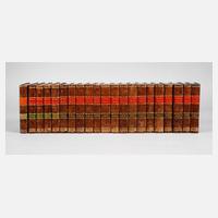 ”Original-Ausgabe” Wien und Stuttgart 1816–1822, bei Kaulfuß und Armbruster in der Cotta'schen Buchhandlung, 21 (von 26) Bde., Bd. 1 bis 21/von Gedichte bis Divan, Format Kl. 8°, Halbledereinband mit rotem und grünem Rückenschildchen, Deckel in braunem Marmorpapier, Gelbschnitt, jeweils mit Titelkupfern, im 17. Bd. Portrait Goethes als Titelkupfer, vgl. Brief Cotta an Goethe vom 19. März 1816: ”Zur Steuerung des Nachdrucks muß ich in Wien eine Ausgabe machen lassen, dort wollen sie nun aber schlechterdings Titelkupfer – etwas niedliches soll gegeben werden, aber besonders wünschte ich ein ähnliches Portrait von Eurer Excellenz zu geben; dörfte ich mir nicht schmeicheln, daß Sie mir eine getreue und gute Zeichnung der Art möchten verfertigen lassen?”, altersentsprechend schöner Zustand mit normalen Altersspuren, geringe Lesespuren.