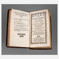 Opere di Giulio Cesare Cortese [italienischer Dichter, 1570 bis 1640] in lingua Napoletana, in questa XV. impressione purgate con somma accuratezza da infiniti errori ... all'illustrissimo & eccellentiss. Sig. Don Giulio Mastrillo duca di Marigliano, Napoli 1666, Format 12°, 96, 130, 96, 71, 84, 72 S., enthält 1. Micco Passaro nnammorato, Poema eroico, 2. La rosa, 3. La vaiasseide, poema, 4. Li trauagliuse ammure de Ciullo, e Perna, 5. Viaggio di Parnaso poema, 6. Lo cerriglio 'ncantato poema eroico, Ledereinband der Zeit mit goldener Rückenprägung, altersentsprechend guter Zustand.