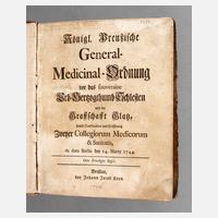 Königl. Preußische General-Medicinal-Ordnung vor das souveraine Erb-Hertzogthum Schlesien und die Graffschafft Glatz, sambt Constitution und Eröffnung zweyer Collegiorum Medicorum & Sanitatis, de dato Berlin den 14. Marty 1744, Breslau ohne Jahr, Format Gr. 8°, 96 S., danach General Tax-Ordnung sowohl vor die Medicos und Chirurgos als die Apotheker ..., 94 S. und 11 Blatt, in Pappeinband der Zeit, Altersspuren.