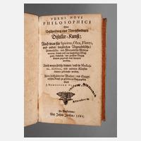 oder Beschreibung einer New-erfundenen Distillir-Kunst: Auch was für Spiritus, Olea, Flores, und andere dergleichen Vegetabilische/Animalische/und Mineralische Medicamenten/damit auff eine sonderbare Weise gantz leichtlich/mit grossem Nutzen können zugericht und bereytet werden, Auch wozu solche dienen/und in Medicina, Alchimia, und anderen Künsten können gebraucht werden, Allen Liebhabern der Wahrheit/und Spagyrischen Kunst zu gefallen an Tag gegeben durch J. Rudolpus Glauberum, zu Amsterdam bey Johan Jansson 1661, Format Kl. 8°, fünf Teile, 94 S./1 Blatt/238 S./3 Blatt/79 S./2 Blatt/122 S./1 Blatt/90 S./5 Blatt/106 S./1 Blatt, 11 Holzschnitte, in wenig späterem Pergamenteinband, dieser mit goldener Deckelprägung (Supralibros) in Form des Wappens Friedrich III. von Sachsen-Gotha-Altenburg: ”F” im Kreis mit älterem Kurhut bekrönt zwischen schwingenhaften Palmblättern, um den Kreisrand die einzelnen Zahlen des Jahres 1-6-9-4, rückseitiger Deckel mit Wappen des Herzogtums, am unteren Buchrücken handschriftlich bezeichnet ”K. 15.”, am Kapital handschriftlicher Titel, darunter Klebeschildchen, rot gesprenkelter Schnitt, Titelblatt mit Bibliotheksstempel der chirurg. Bibliothek Altenburg, Bindung noch sehr gut erhalten, Seiten teilweise mit leichten Feuchtigkeitsflecken, normale Alters- und Gebrauchsspuren. Autoreninfo: Johann Rudolph Glauber, Apotheker und Alchemist, 1604 im mainfränkischen Karlstadt geboren, ab 1640 in Amsterdam, die ”Furni novi philosophici” erschienen erstmals 1646 und stellen Glaubers erstes Buch dar, die Neue Deutsche Biographie schreibt: ”Das Lebenswerk G.s ist zu untergliedern in einen außergewöhnlich umfänglichen und vielgestaltigen experimentellen sowie einen die Grundlagen der materiellen Welt betreffenden Teil, der dem steten Bemühen um die Einsicht in das Wesen von Materie und bedingender Kraft gilt. Er ist in der Denkgesinnung mit Paracelsus ... und damit zugleich der Suche nach der quinta essentia, dem alles lösenden Alkahest, der prima materia zugewendet. Er ist zugleich mit Boyle auf dem Wege zu klarer Einsicht in das Wechselspiel chemischer Stoffe. Im sinnvoll durchdachten, zielbewußt durchgeführten Experiment ist er richtungweisend und seiner Zeit weit voraus. Er ist um die Gewinnung reiner chemischer Verbindungen, zugleich um die Schaffung experimentell-technischer Möglichkeiten zu ihrer Großherstellung bemüht, wodurch er zu einem maßgeblichen Begründer der chemischen Technologie wird.” (E. Pietsch, NDB 6, 1964, S. 437).