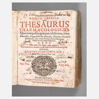 Pharmacopoeia Medico-Chymica sive Thesaurus Pharmacologicus, quo composita quaeque celebriora; hinc Mineralia, Vegetabilia & Animalia Chymico Medicè describuntur, atque insuper Principia Physicae Hermetico Hippocraticae candidè exhibentur. Opus non minùs utile Physicis, quàm Medicis: Editione sexta correctum ... Authore Johanne Schrödero, M.D., Frankfurt 1669, Format 8°, ein Porträtkupferstich, 33 Blatt, 516 S. (Liber I–III.) und 348 S. (Liber IV u. V), 30 Blatt Index rerum, 24 S. appendix, 43 Blatt Index morborum, wenige Holzschnitte, auf Vor- und Nachsatz sowie den Seiten teilweise handschriftliche Anmerkungen, gering wurmstichig, Frontispiz eingerissen, mäßige Altersflecken, Pergamenteinband der Zeit mit Rückenbeschriftung, altersentsprechend befriedigendes bis gutes Exemplar.