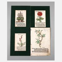 1) Buchseite aus dem ”Gart der Gesundheit” von Johann Schönsperger 1485 mit Darstellung der Weißen Zaunrübe (Bryonia alba), 2) Drei Buchseiten aus einem Gartenbuch des 16. Jhs. mit Darstellung der Hyjucca gloriosa, des Papaver pleno flore und des Löwenmäulchens (Antirrhinum), normale Altersspuren.