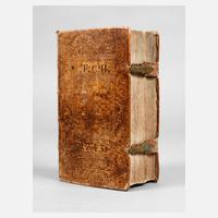 zu einem Buch gebunden, bestehend aus zwei Werken von Franz Widenmann und einem von Franz Balthasar von Lindern, 1) Institutiones Chirurgiae, Seu Compendiosum Collegium Chirurgicum Universale, Das ist: Kurtze und allgemeine Lehre Von der Wund-Artzney, Derselben neuere ..., der Vernunfft, wahren Erfahrung, und mit vieler Hochgelehrten Männer Lehr-Sätzen übereinstimmende Grund-Regeln, Gebauet auf eine kurtze, jedoch gründliche und wahre Anatomiam, Physiologiam, Pathologiam und Therapeuticam: Nebst gleichmäßig-deutlicher Erläuterung der auf die Lehre Alcali & Acidi gegründeten Würckung der Artzneyen ... bey Versammlungen seiner Zuhörer vorgetragen von Frantz Widenmann, der Kayserl. freyen Reichs-Stadt Augspurg ... Wund-Arzt, 2. Auflage, Augsburg 1737, ein Kupferstichfrontispiz/416 S./4 Blatt, 2) Neuer curieuser und ausführlicher Bericht, Stein und Brüche/so wohl mit als ohne Castrierung/zuschneiden/wie auch Staaren zustechen: Darinnen die neue und richtige Ursachen/ohnfehlbare Kenn-Zeichen/bewährte Artzney-Mittel ... Zu Dienst und Nutzen des nothleidenden Nächsten/wie auch denen treu-meinenden Chirurgis und Liebhaberen der Chirurgie zum besten ausgefertiget und mit nöthigen gantz neuen Kupffern versehen von Francisco Widenmann, Augsburg 1719, Kupferstichfrontispiz (am oberen linken Rand fragmentiert)/8 Blatt/176 S./3 Blatt und 4 Kupferstichtafeln, 3) Speculum Veneris noviter politum: Das ist Neu-ausgeputzter Venus-Spiegel oder Beschreibung derer meisten Venus-Kranckheiten/wie selbige ihren Anfall beweisen/und so sie Wurtzel gefasset, was sie für mancherley Ungelegenheiten nach sich ziehen ... Insonders denenjenigen dienlich( so sich auff Reisen, oder sonst an andern Oertern befinden, wo ihnen weder Medicus noch Chirurgus an die Hand gehen kann ... zu Papier gebracht von Francisc. Balth. von Lindern, Straßburg 1736, mit einem Kupferstichfrontispiz (im Hintergrund die Ansicht von Straßburg)/4 Blatt/30 S./4 Blatt/536 S./8 Blatt, alle drei zu einem Buch gebunden, Format Kl. 8°, Ledereinband der Zeit mit ornamentaler Deckelprägung, darauf die Initialen ”F.G.H” und das Jahr 1743, Buchschließen noch sehr schön erhalten, Alters- und Lesespuren, wenige handschriftliche Notierungen.