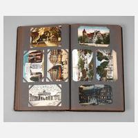 fast 300, vorwiegend topographische Ansichtskarten, zahlreiche Gruß-aus-Karten, darunter Souvenir de Luxembourg, Gruß aus Einsiedeln, ... aus Eisenach, ... aus Luzern, ... aus Karlsruhe, .. aus Berlin, ... aus Döberitz/Truppen-Übungsplatz, ... aus Neustadt a. Haardt, ... aus Charlottenburg, ... aus dem Bergischen Lande, ... aus Heidelberg, ... aus Andernach, ... aus Frankfurt, ... aus den Bergen, ... von dem Truppenübungsplatz Elsenborn, ... von der Rathewalder Mühle sächs. Schweiz, ... aus Dresden, ... vom Alfeld-See, ... aus Thale, ... aus Dagsburg, ... aus Basel, ... aus der Residenz Hannover, ... aus dem Theirgarten, ... aus Wiesbaden, ... aus Magdeburg, ... aus Nürnberg, ... aus dem Teutoburger Wald, ... aus Bad Reichenhall, schöne farbige Karte Leipzig Reichsgericht, Berliner Gewerbe-Ausstellung 1896 Officielle Postkarte, zahlreiche Rothenburg o. d. Tauber, Ostgebiete wie Goldberg in Schlesien, Oppeln, Königsberg, Gruß aus Laurahütte-Siemianowitz, teilweise farbig lithogr., in zeitgenössischem Postkartenalbum mit floralem Deckelmotiv, normale Alters- und Gebrauchsspuren, H Album ca. 38 cm.