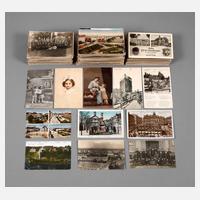 um 1900 und 1. Hälfte 20. Jh., ca. 500 Stück, zahlreiche topographische Karten, u.a. Bingen mit Bingerbrück, Kiel Gaarden im Werftpark, Blick auf das Erholungs- u. Fischerhaus, Knusperhäuschen Bad Elmen, Dresden Ausstellung, Chemnitz Rosarium, Chemnitz Küchwaldschenke, Posen Blick auf die Altstadt, Breslau Eingang zum Zoologischen Garten, Postkarten 3. Reich, u.a. Erstes Fest der Leibesübungen im Kreis Vogtland in Treuen (3. Reich), Olympisches Dorf Eingang, französische Postkarten um 1914, u.a. La Citadelle Lille, Cambrai la Place d'Armes le matin, Motivkarten, Serienkarten, Kitschkarten, Kriegspostkarten, u.a. Französischer Schützengraben bei Pintheville, Parole 1917 Sieg d. Frieden!, Gruß von der Rekruten Musterung, Portraitkarten, Werbepostkarten, u.a. Vernichtet die Schnecken durch Hederich-Kainit, Asbach-Uralt, teilweise lithogr., einige unbeschrieben, normale Alters- und Sammelspuren.