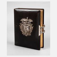 entleertes Gründerzeit-Fotoalbum, prächtige plastische Deckelvignette, mit preußischem Adler über militärischem Gerät und Schild mit den Initialen MTA, Inhaltsblätter, bezeichnet ”Die Officiere der Militair-Turn-Anstalt im Winter-Cursus 1889/90, 16 starke Pappen mit Einschiebefenstern von Fotografien im Visit-, wenige im Kabinett-Format, reich mit goldenem Zierwerk, Lederalbum mit intakter Schließe, normale Alters- und Gebrauchsspuren, H Album ca. 27,5 cm.