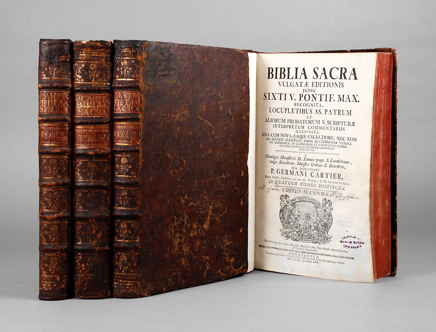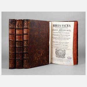 Biblia sacra vulgatae [Lateinisch-Deutsch] editionis jussu Sixti V. Pontif. Max. recognita, loculpletibus ss. patrum et aliorum probatprum s. scripturae interpretum commentariis illustrata, una cum nova, eaque excultiore, nec non ad sensum scripturae magis accommoda versione germanica, in commodum et utilitatem totius ecclesiae catholicae praesertim germanicae elucubrata, a theologis monasterii D. Ettonis prope S. Landelinum, vulgo Ettenheim-Münster ordinis S. Benedicti, sub directione P. Germani Cartier ... in quatuor tomos distincia, editio secunda, Konstanz 1770, Format Gr. 4°, 4 Bde., 1. Band mit 15 Blatt, 757 S. und allen 26 Kupferstichtafeln, 2. Band mit 562 S. und 3 Kupferstichtafeln, 3. Band mit 588 S. und 6 Tafeln, 4. Band mit 571 S., 48 S. dissertatio critica, 26 Blatt index, 12 S. syllabus editionum s. scripturae und 30 Kupferstichen, Ledereinbände der Zeit mit Rückenbeschriftung, Rotschnitt, innen altersentsprechend sehr guter Zustand, Einband alt restauriert, Oberfläche des Leders mit Altersspuren.