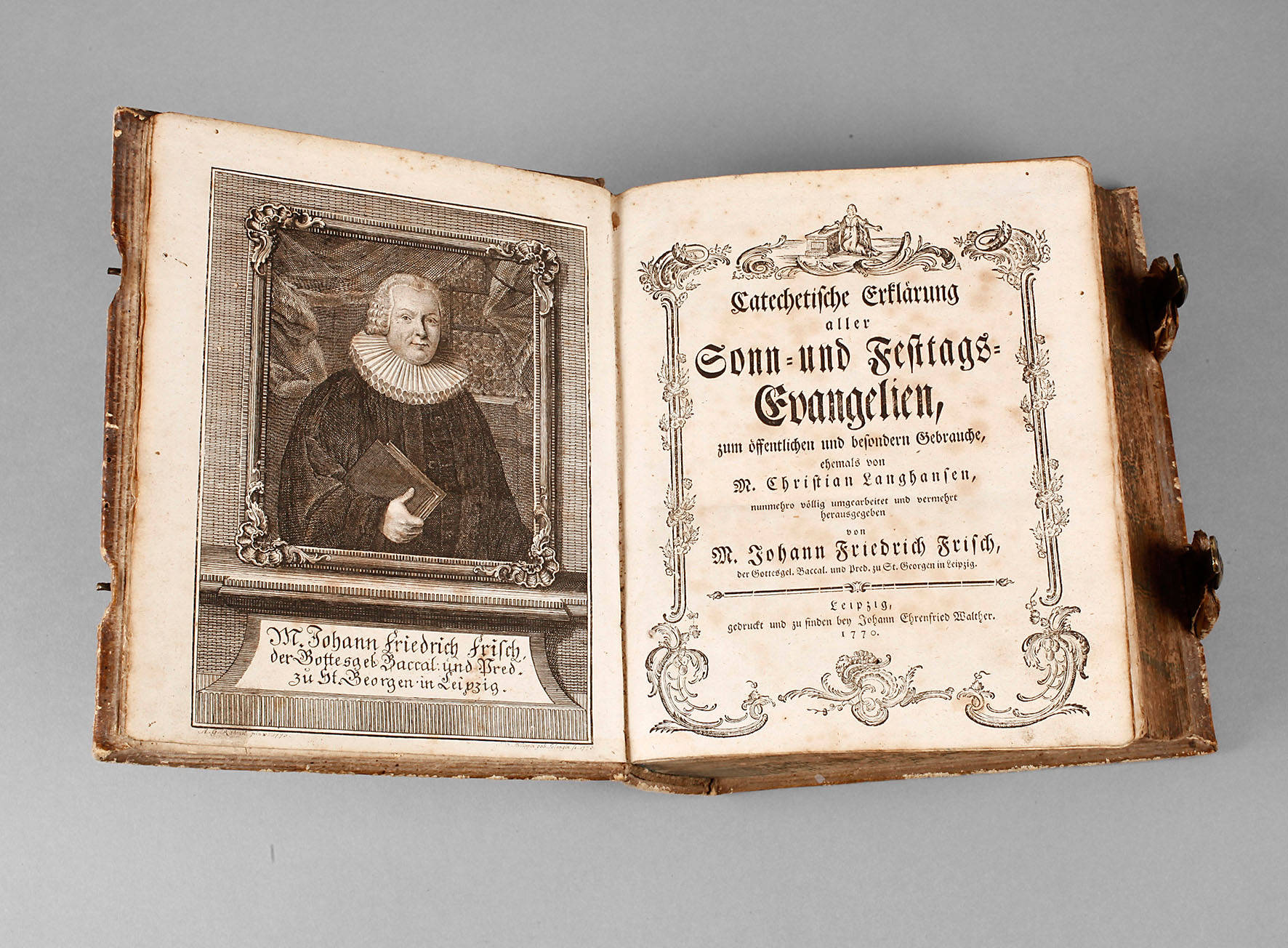 Catechetische Erklärung aller Sonn- und Festtags-Evangelien, zum öffentlichen und besondern Gebrauche, ehemals von M. Christian Langhansen, nunmehro völlig umgearbeitet und vermehrt herausgegeben von M. Johann Friedrich Frisch, der Gottesgl. Baccal. und Pred. zu St. Georgen in Leipzig, bei Johann Ehrenfried Walther Leipzig 1770, Format 8°, 831 S. und 9 Blatt, mit Kupferstichfrontispiz, welche den Autor im Hüftbildnis zeigt, Kupferstecher J. D. Philippin, originaler Ledereinband mit ornamentaler Prägung, Seiten und Einband gering wurmstichig, originale Buchklappen noch voll funktionstüchtig.