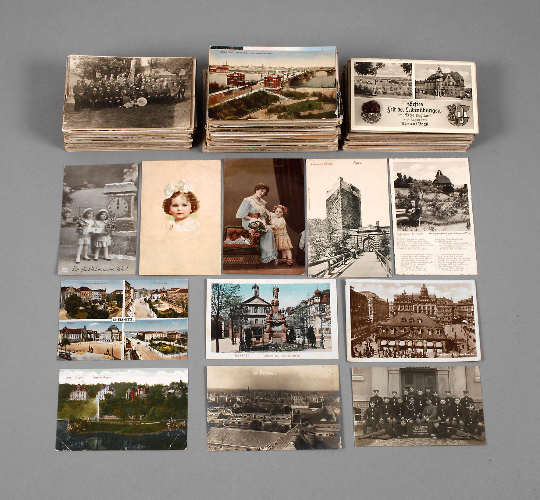 um 1900 und 1. Hälfte 20. Jh., ca. 500 Stück, zahlreiche topographische Karten, u.a. Bingen mit Bingerbrück, Kiel Gaarden im Werftpark, Blick auf das Erholungs- u. Fischerhaus, Knusperhäuschen Bad Elmen, Dresden Ausstellung, Chemnitz Rosarium, Chemnitz Küchwaldschenke, Posen Blick auf die Altstadt, Breslau Eingang zum Zoologischen Garten, Postkarten 3. Reich, u.a. Erstes Fest der Leibesübungen im Kreis Vogtland in Treuen (3. Reich), Olympisches Dorf Eingang, französische Postkarten um 1914, u.a. La Citadelle Lille, Cambrai la Place d'Armes le matin, Motivkarten, Serienkarten, Kitschkarten, Kriegspostkarten, u.a. Französischer Schützengraben bei Pintheville, Parole 1917 Sieg d. Frieden!, Gruß von der Rekruten Musterung, Portraitkarten, Werbepostkarten, u.a. Vernichtet die Schnecken durch Hederich-Kainit, Asbach-Uralt, teilweise lithogr., einige unbeschrieben, normale Alters- und Sammelspuren.