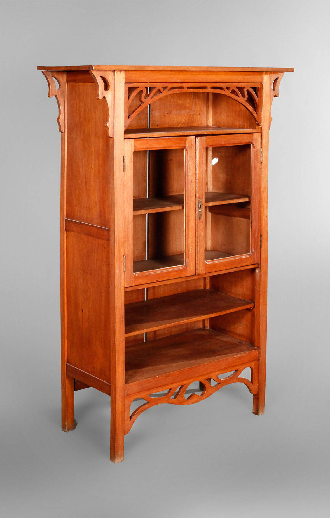 aus massivem hellen Nussbaum, um 1900, in Form einer Regaletagere mit zwei verglasten Türen, stärkere Alters- und Gebrauchsspuren, rest.bed., Maße 131 x 86 x 35 cm.