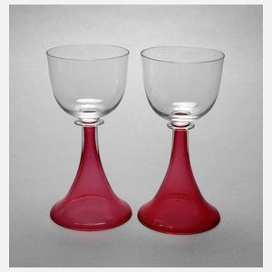 um 1910, roséfarbenes und farbloses Glas, hohl gearbeiteter Glockenfuß mit darüber liegendem Nodus, angesetzte Kuppa, guter Zustand, H 15,3 cm.