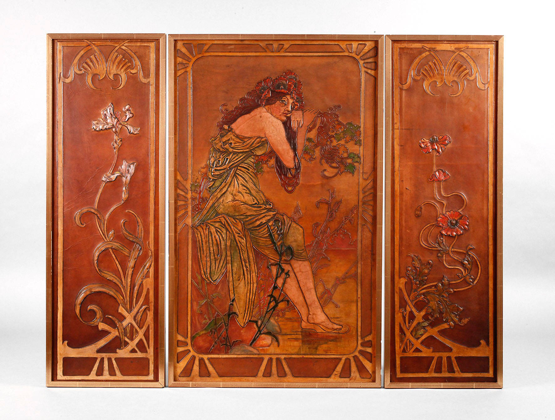 um 1900, unsigniert, Kopie nach ”Der Sommer” aus Muchas Jahreszeitenzyklus von 1896, geprägtes, brandschattiertes und farbig gefasstes Glattleder, Mitteltafel mit Darstellung einer Jugendstilschönheit im lang fließenden Gewand, auf einem Stein am Fließ sitzenden, Kopf und Hände sanft an eine Blütenranke geschmiegt, das Haupt üppig verziert von Mohnblumen, die Seitenteile ornamental gestaltet mit Schwertlilien und Mohnblüten, min. Altersspuren, in schlichten Leisten gefasst, Maße zusammen ca. 85 x 107 cm.