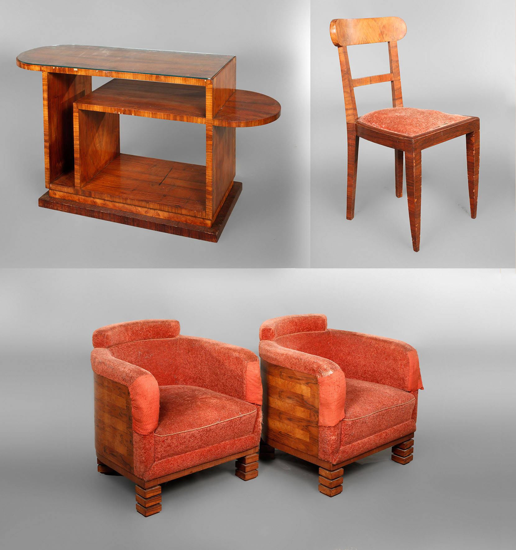 passend zu vorhergehender Position, niedrige Clubsessel, mit halbrund furniertem Rücken, geometrischer Streifendekor, Sitzbezüge verschlissen, kleines Bücherregal mit vereinzelten minimalen Fehlstellen, Oberfläche rest.bed., dazu einfacher Stuhl aus gleichem Haushalt, Maße Regal H 64 x B 120 x T 40, Maße Sessel H 71 x B 65 x T 70 cm.